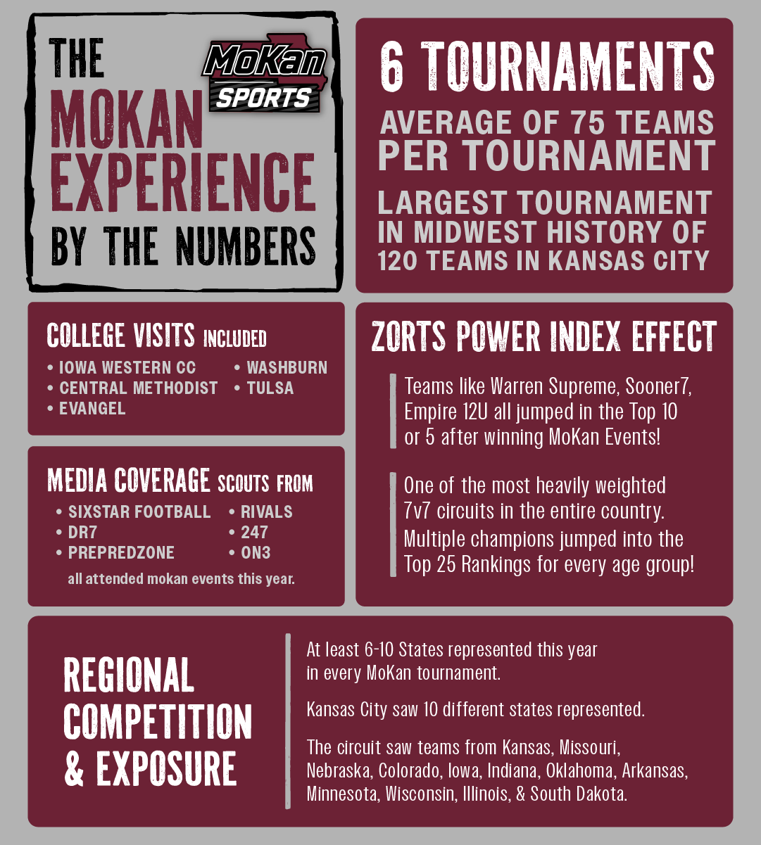 MoKan was established in 2022 where we were one of the first 7v7 circuits in the region. MoKan started with one tournament & grew it to 7 tournaments coming in 2025 that is recognized as one of the premier 7v7 circuits in the country.